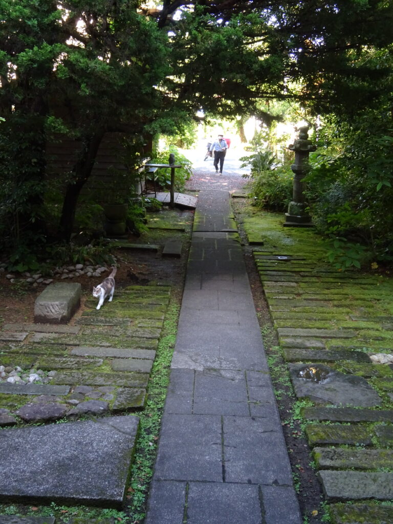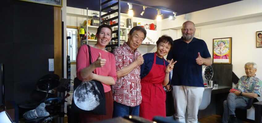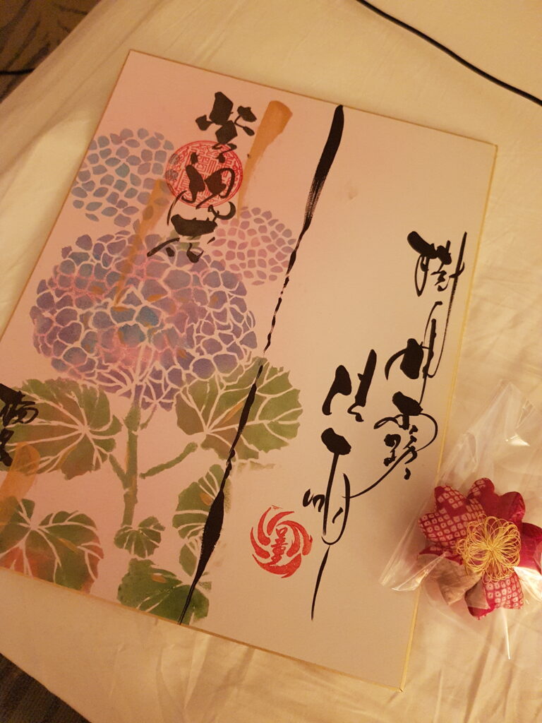 Heute Nachmittag spazieren wir nochmals für ein Bier nach Kawazu und unterhalten uns dort mit Herrn und Frau Suzuki. Sie machen uns auf einen kleinen versteckten Tempel aufmerksam. Es ist ein Tempel für Kappa (Wesen aus dem japanischen Volksglauben) und ein ganz ruhiger Ort. Wir fühlen uns dort sofort sehr wohl. Zum Abschied werden wir mit einem Bild beschenkt. Auch Frau Suzuki schenkt uns eine selbstgemachte Kirschblüte aus Kimono-Stoff. So lieb.