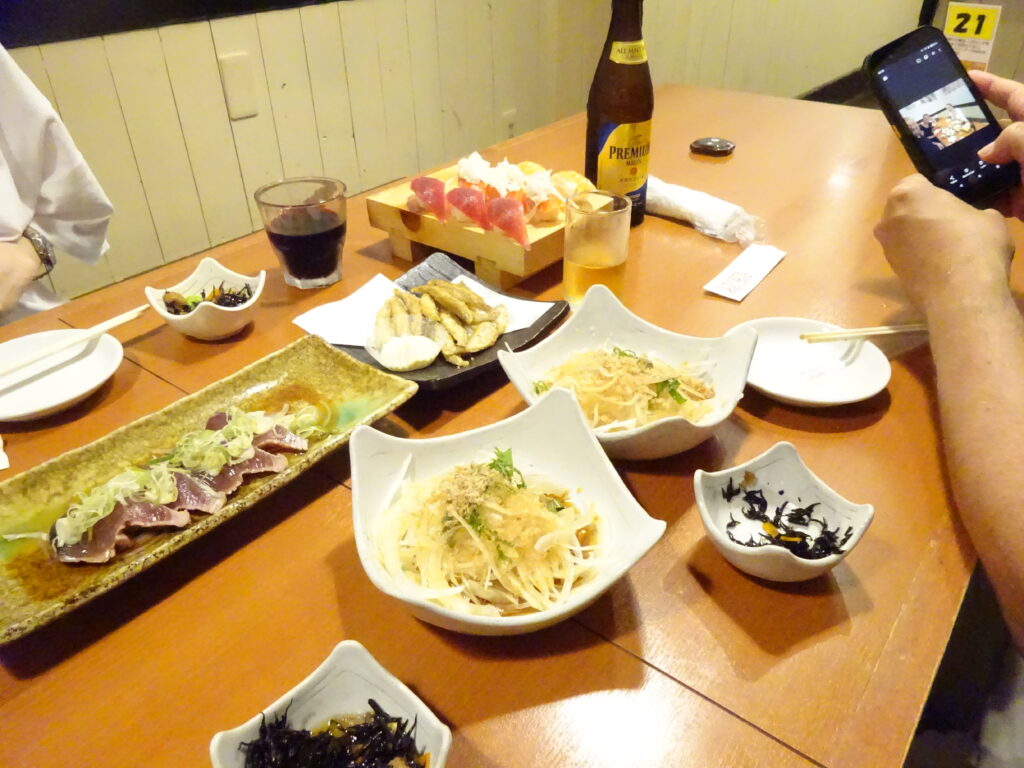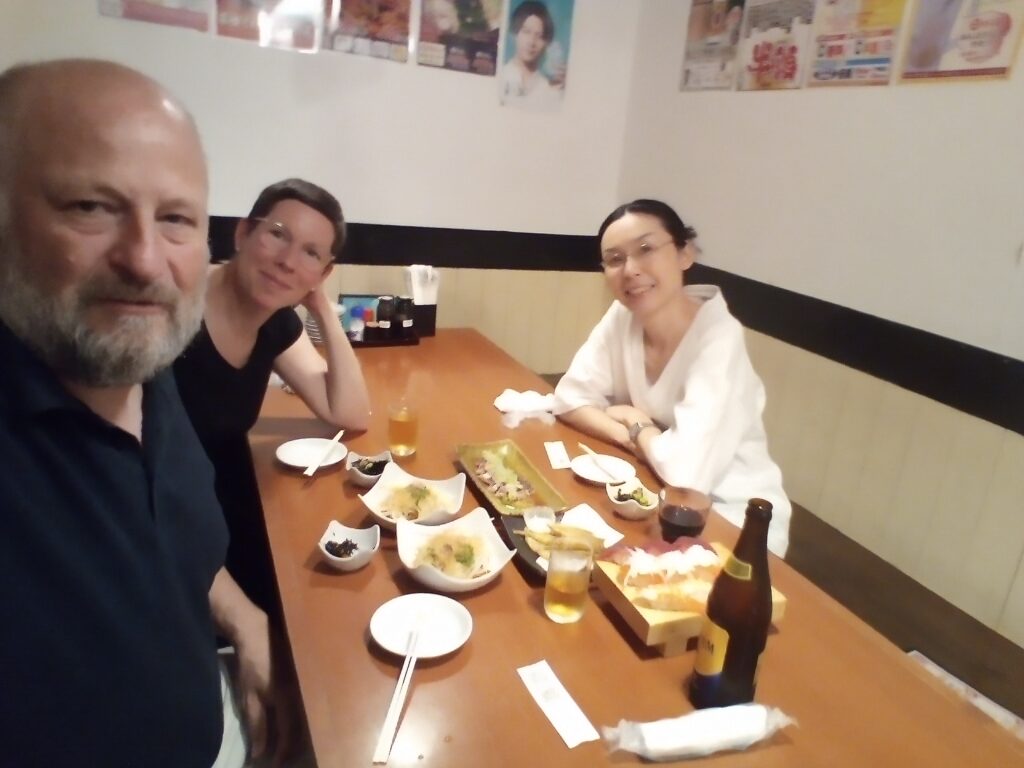 Zurück im Hotel KOKO in Sakae erholen wir uns etwas von der Reise und fahren danach nach Sango Stn. Dort wartet schon Nanami auf uns und wir essen in einem super Izakaya Sushi, Tempura, Edamame, Zwiebelsalat etc.