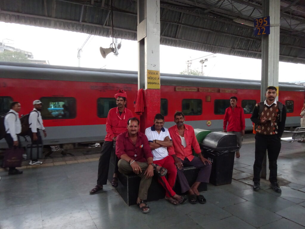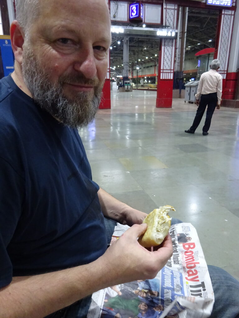 Wir überbrücken die Wartezeit mit Chai und einem feinen Masala Omlet Brötli mit (sau)-scharfen green Chilli. Wir beobachten Frauen mit schwerm Gepäck auf dem Kopf balancierend, Gepäck- und Cargoträger die ihre Karren mit schweren Kisten und Säcken volladen, Putzfrau im Streit mit Chef – langweilig wirds uns nicht.