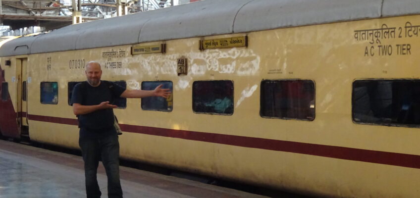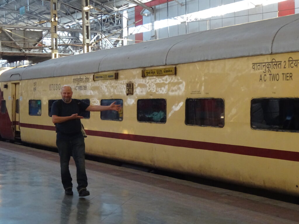 Um 08:00 Uhr können wir einsteigen: 19015 / SAURASHTRA EXP nach Ahmedabad. Fahrtzeit 11 Stunden im Two AC Sleeper Abteil. Wir haben unsere eigene Liege und können uns wunderbar ausstrecken. Bei jedem Halt steigen Verkäufer ein und bieten ihre Ware an: Chai, Idli, Biriani, Brötli mit Kartoffel-Gemüse-Paties und Früchte. Ein Schlaraffenland!