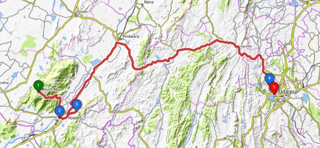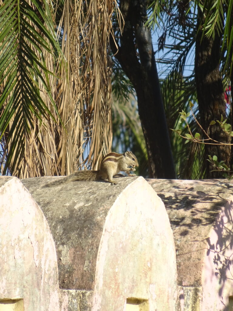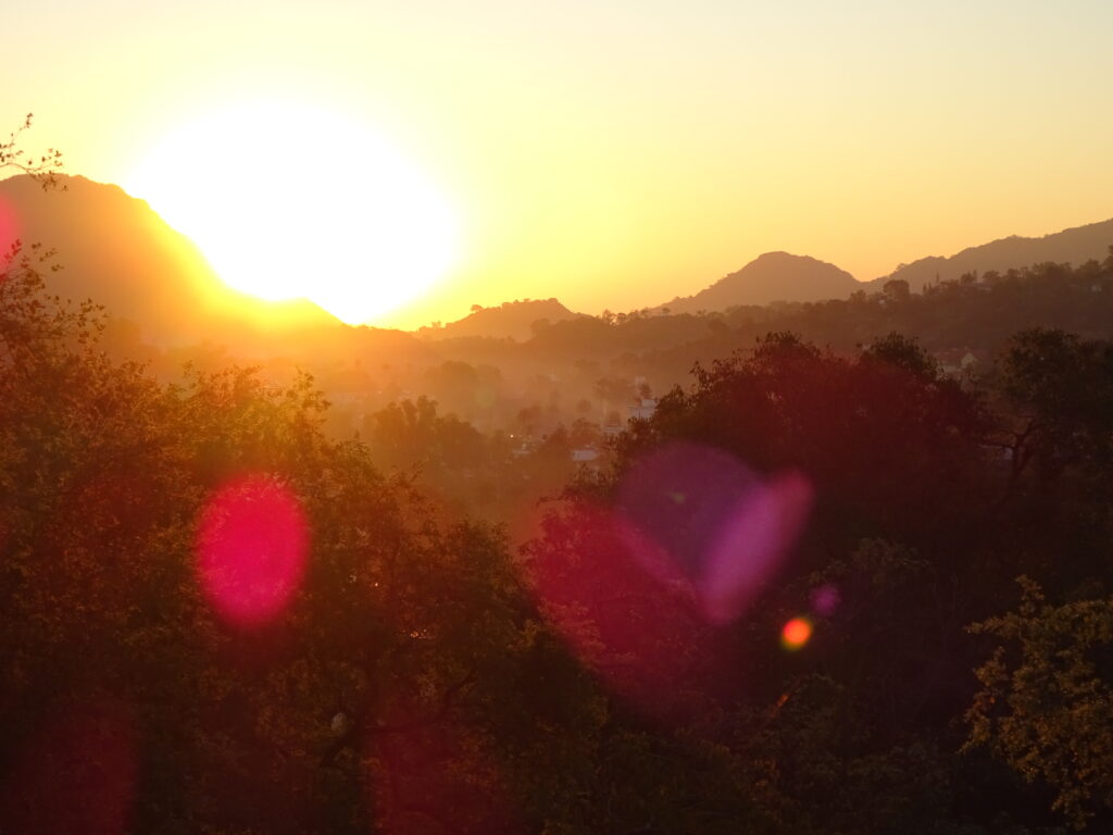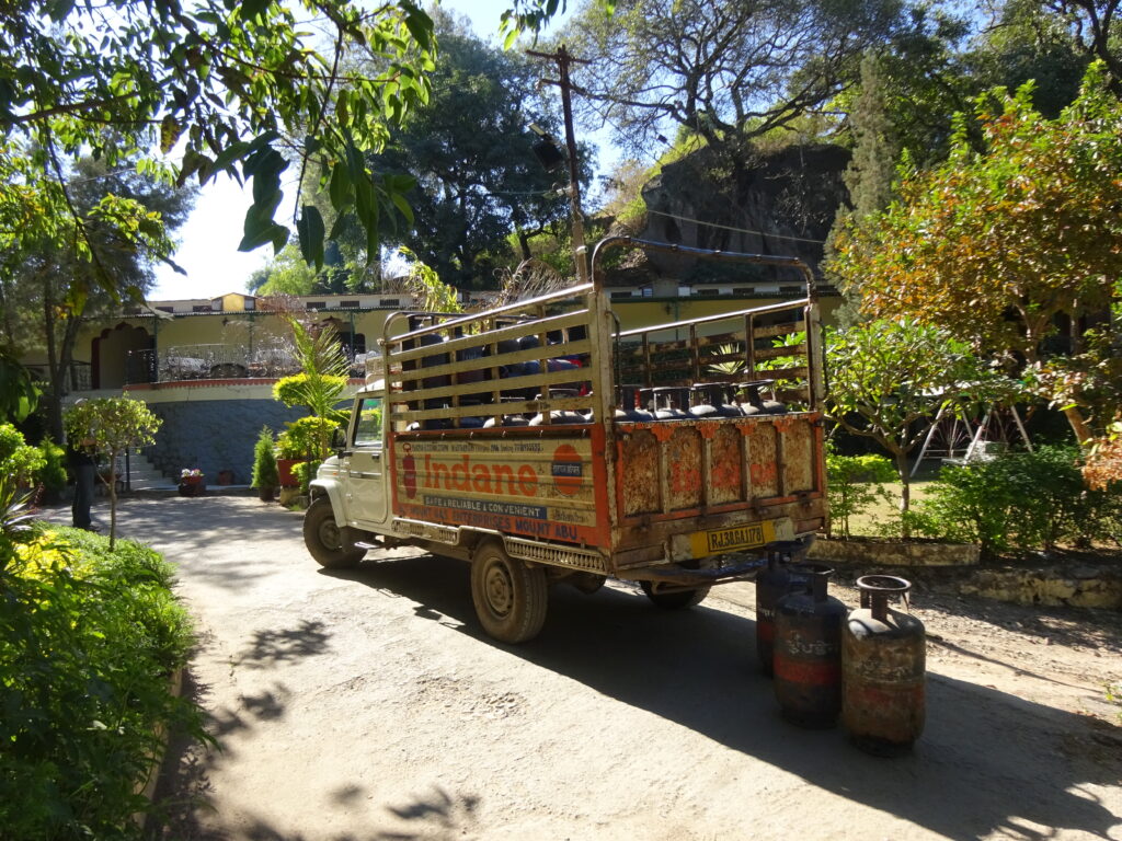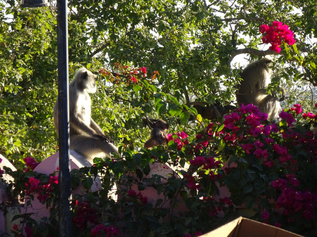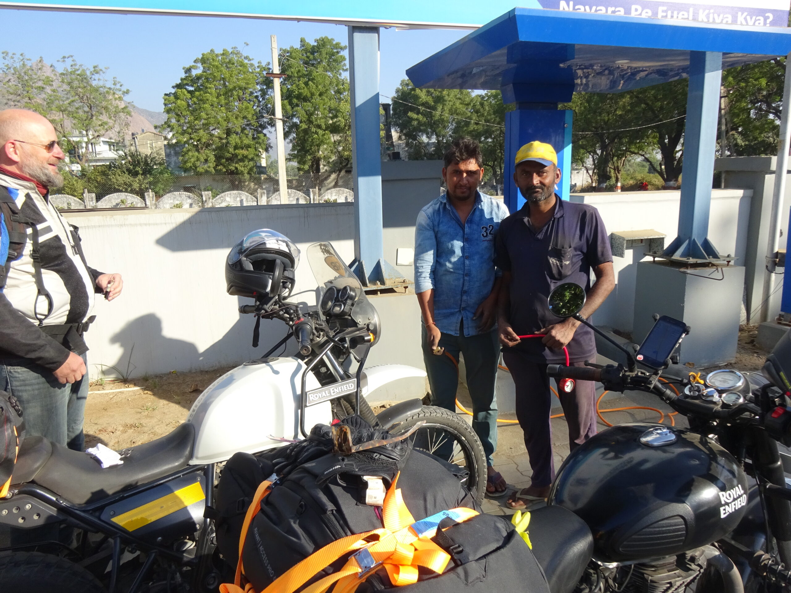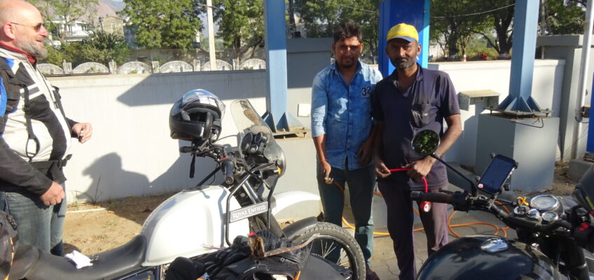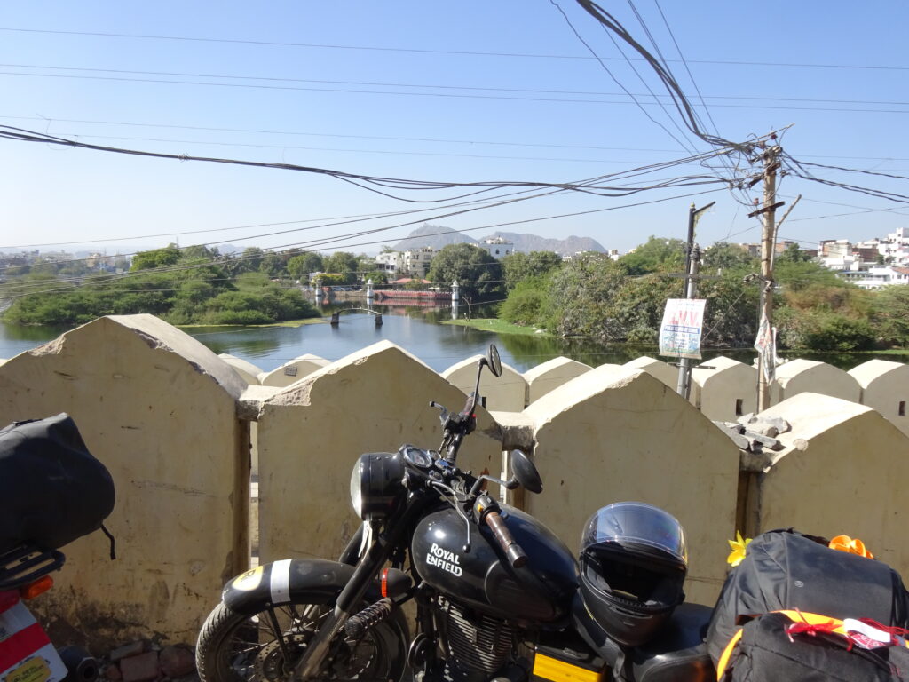 25.11.22 – 08:00 Uhr Mount Abu. Es ist noch erfrischend kühl. Die Affen sonnen sich auf den warmen Steinen, wir sind gut eingepackt und bereit für die Abfahrt Richtung Udaipur. Das Bergpanorama ist atemberaubend – leider gibt es dazu keine Fotos da wir mit Töfffahren beschäftigt waren. Unten in Abu Road angekomment, heisst es erstmal Auftanken und Pneudruck messen. Es geht einiges hinein – Benzin und Luft. Es liegen ca. 160km vor uns. Unsere eigentliche Route hätte uns auf kleinern Strassen zum Ziel führen sollen. Jedoch stellen die sich als zu holperig und ungemütlich heraus. So kehren wir um und fahren auf der NH27 weiter. Überraschenderweise ist die Route wirklich schön und es gibt nicht viel Verkehr. Sie führt uns über Hügellandschaften mit Reisfeldern und Palmen und über karge, mit braunem Gras bewachsene Hügel. Ab und zu stossen wir auf ein Hotel und fragen uns, warum es gerade dort steht und wer wohl dort übernachtet.