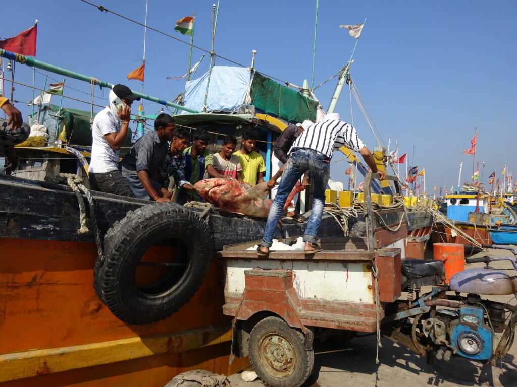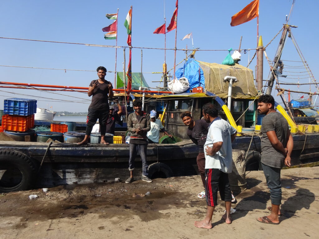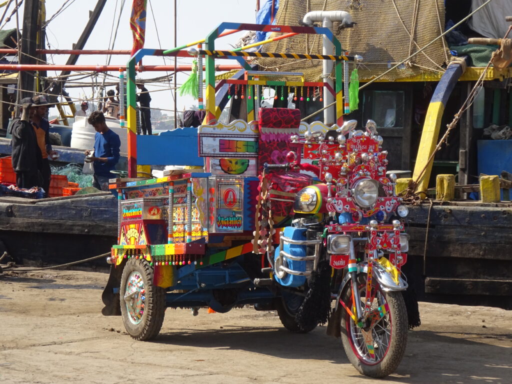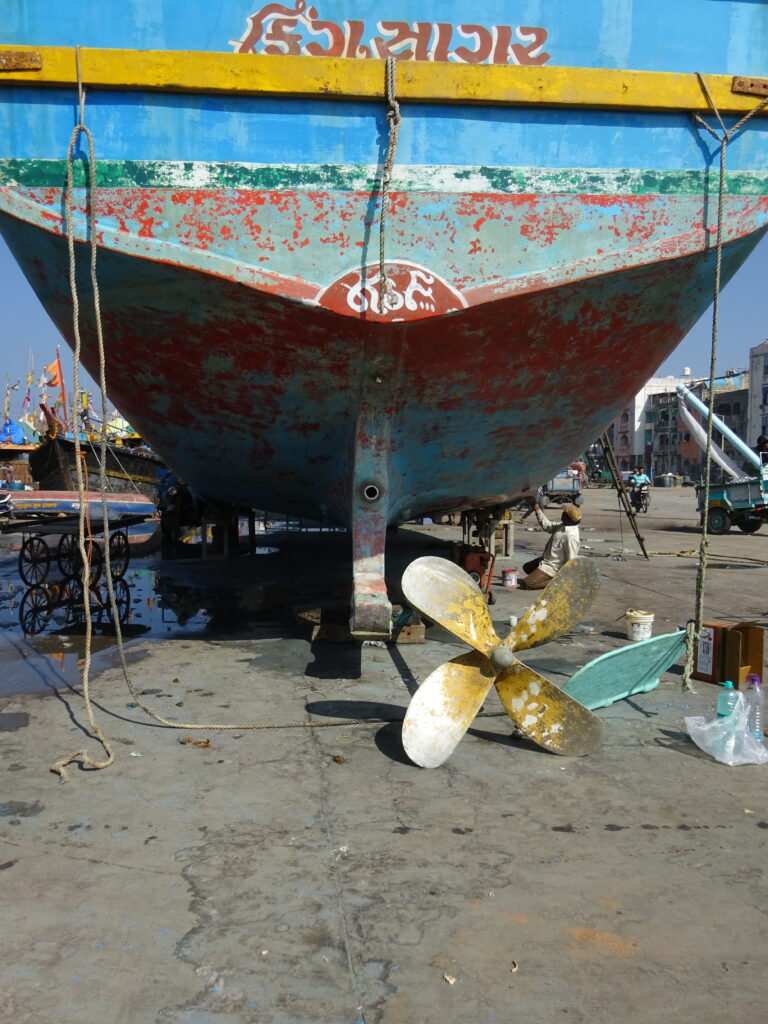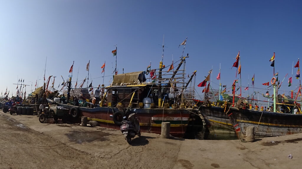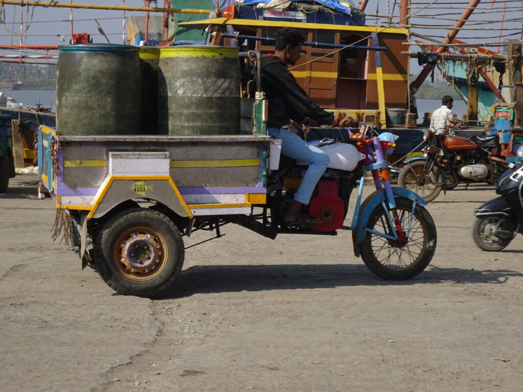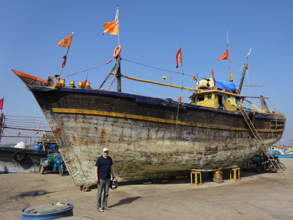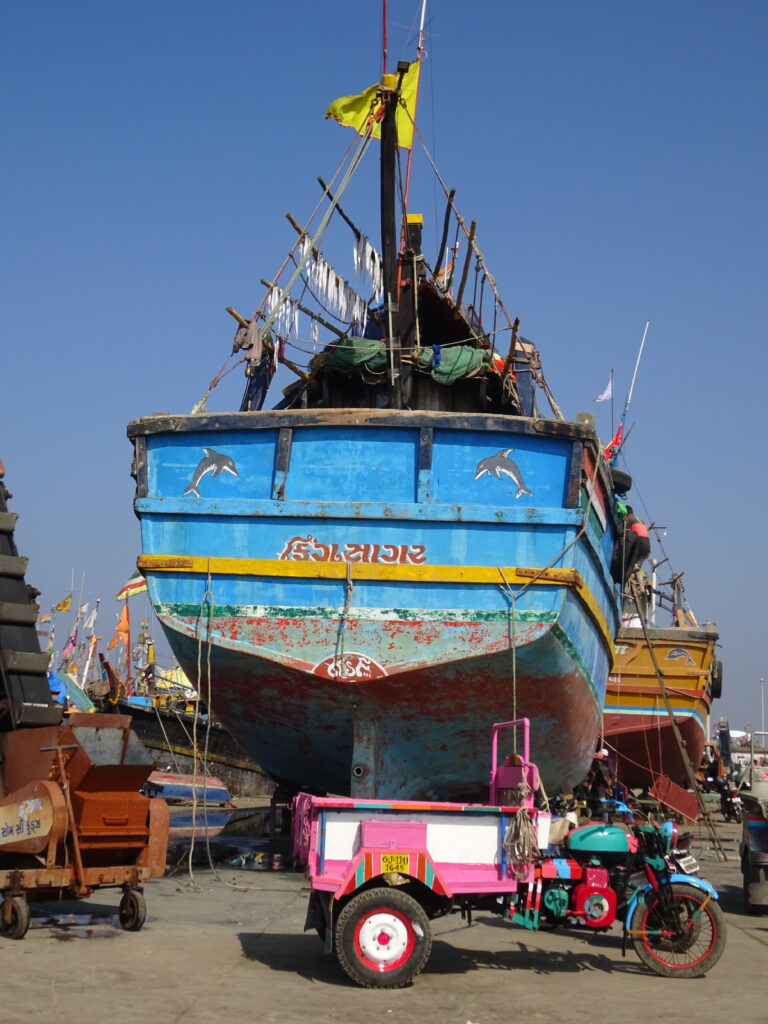 In Vanakbara begrüsst uns ein intensiver Fischduft. Dieser ist jedoch nicht unangenehm, sondern nach Meer riechend frisch. Auf dem Hafen herrscht Hochbetrieb. Es werden Karren voll Fisch transportiert, Lastwagen mit ganzen Eisblöcken herumgefahren und Schiffe neu angestrichen. Die meisten Schiffe sind noch aus Holz – andere aus Fiberglas. Alles ist bunt dekoriert und es wehen hunderte von farbigen Flaggen. Wir kommen aus dem Staunen nicht mehr heraus und könnten stundenlang zuschauen. Nach einem Chai machen wir uns gemütlich auf den Rückweg nach Diu. Wir sind zum Mittagessen bei Ina und Kailash eingeladen.
